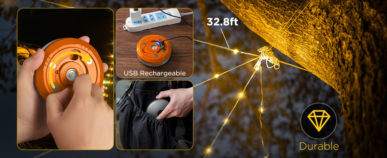 - Portable Storage: The camping light is only 7.4 ounces, very lightweight and portable, it can be easily put into a backpack or handheld device, a quick turn of the handle and the manual device ,32.8FT string lights can resume the camping light in only 30 seconds. The clever design of the string lights for camping ensures portable storage. Undoubtedly a camping essentials.