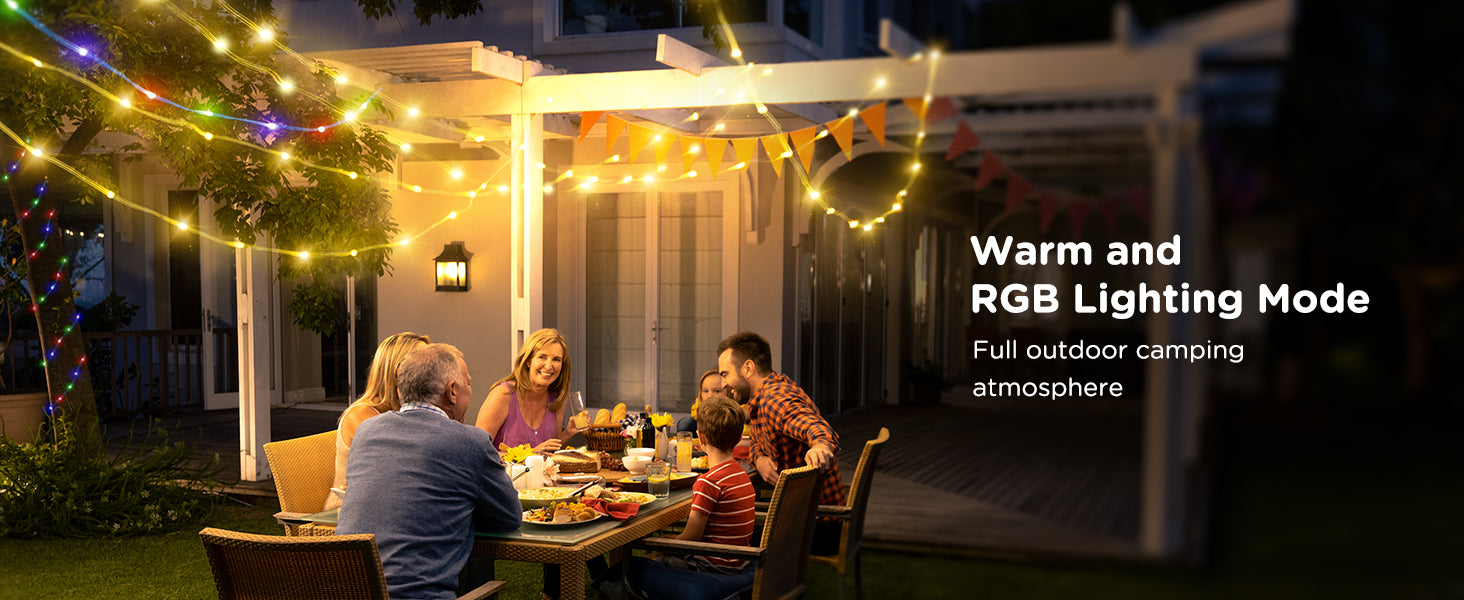 - 8 Lighting Modes: Camping string lights outdoor provide 5+3 modes - warm string lights, RGB alternate flash, RGB breathing, camping light + string light warm, camping glare light, XTE strong light, XTE weak light, XTE SOS flashing light. Great for outdoor,camping, yard, hiking, awning, tent, garden, party, festival, decor.