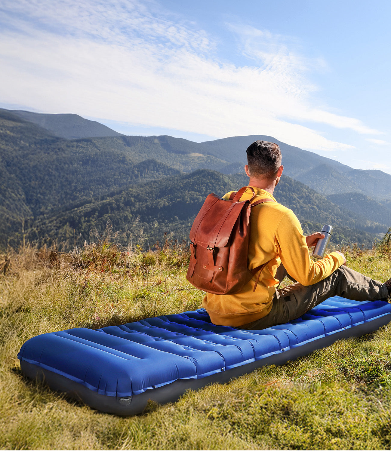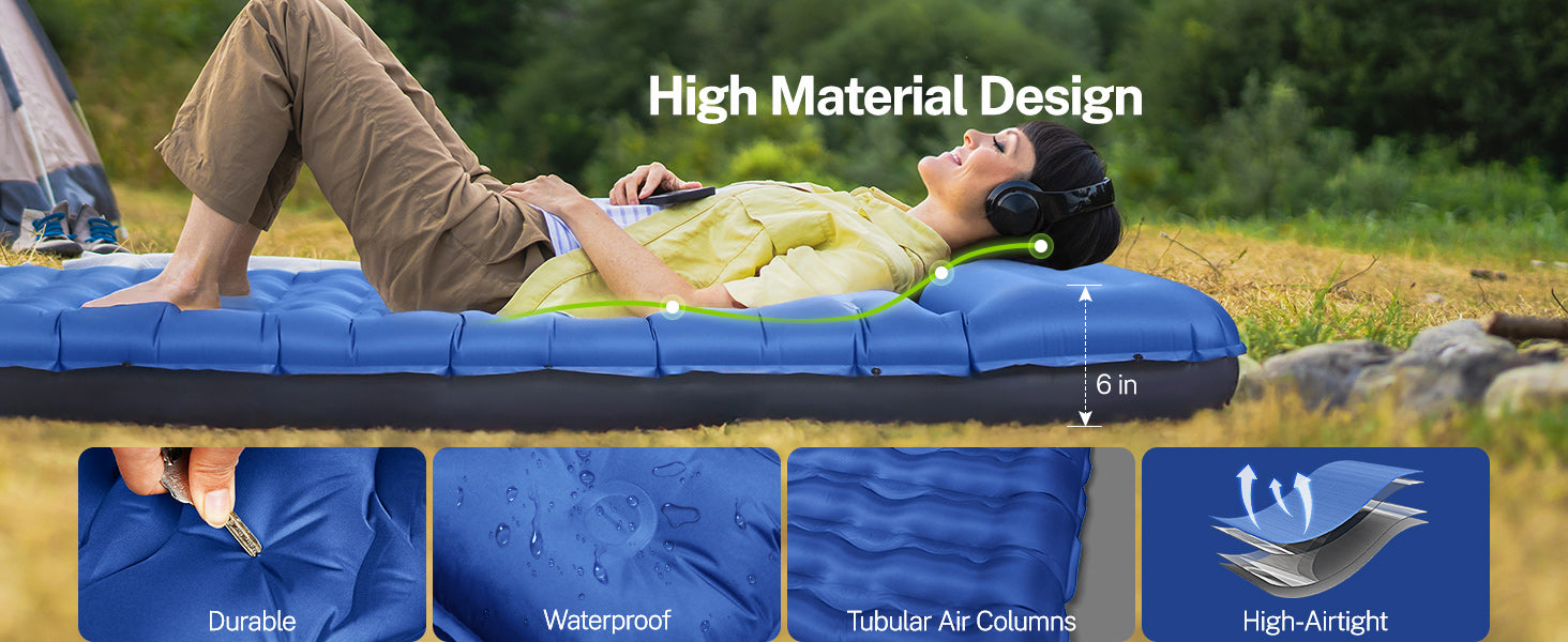 - Durable, Waterproof Material --- Constructed from 50D polyester with a TPU waterproof coating, this durable camping air mattress withstands outdoor wear and tear, keeping you comfortable no matter where you set up camp.