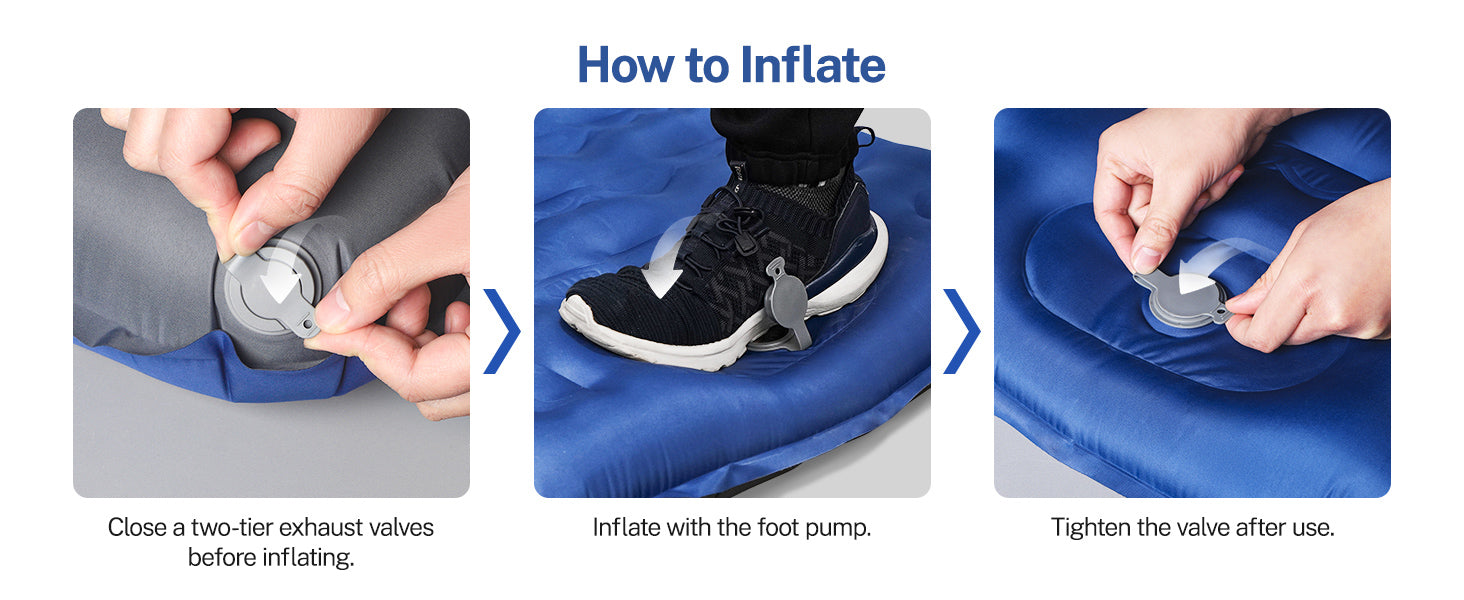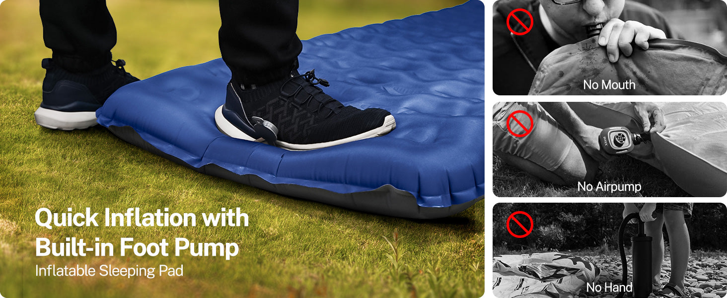 - Easy Inflation with Foot Pump --- Effortlessly inflate the camping pad by stepping on the built-in foot pump. Dual-layer air valves ensure rapid inflation and prevent air leakage, making it ideal for camping or any outdoor activity.